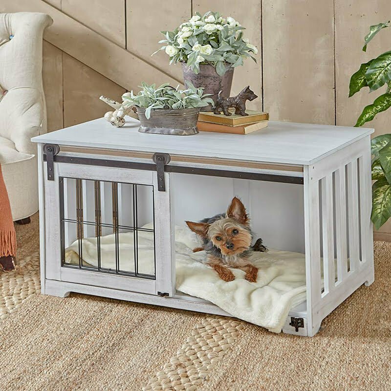 Keep Fido out of trouble in style when you set up a Barn Door Pet Crate. More aesthetically pleasing than its traditional counterpart, this farmhouse-inspired unit keeps your companion comfortably contained. It features a sliding barn door and openings along the side that provide ample ventilation. A latch on bottom keeps the door securely closed.